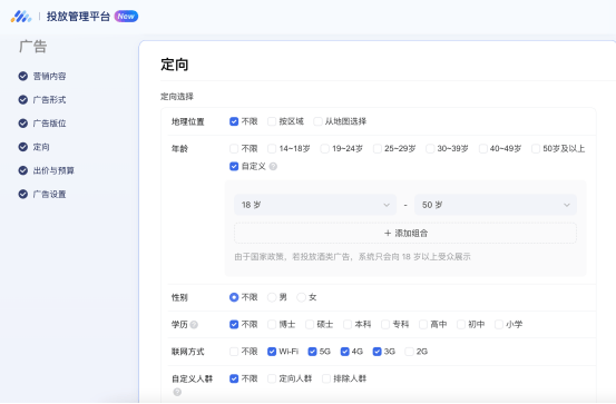 后台精准定位,会根据地理位置、兴趣爱好、年龄等去推广客户的产品,让每一份流量都精准植入用户的账号上,比如你在某一片区域,只想投入方圆5公里范围的用户,那么可以根据地理位置精准投入5公里以内的用户上面