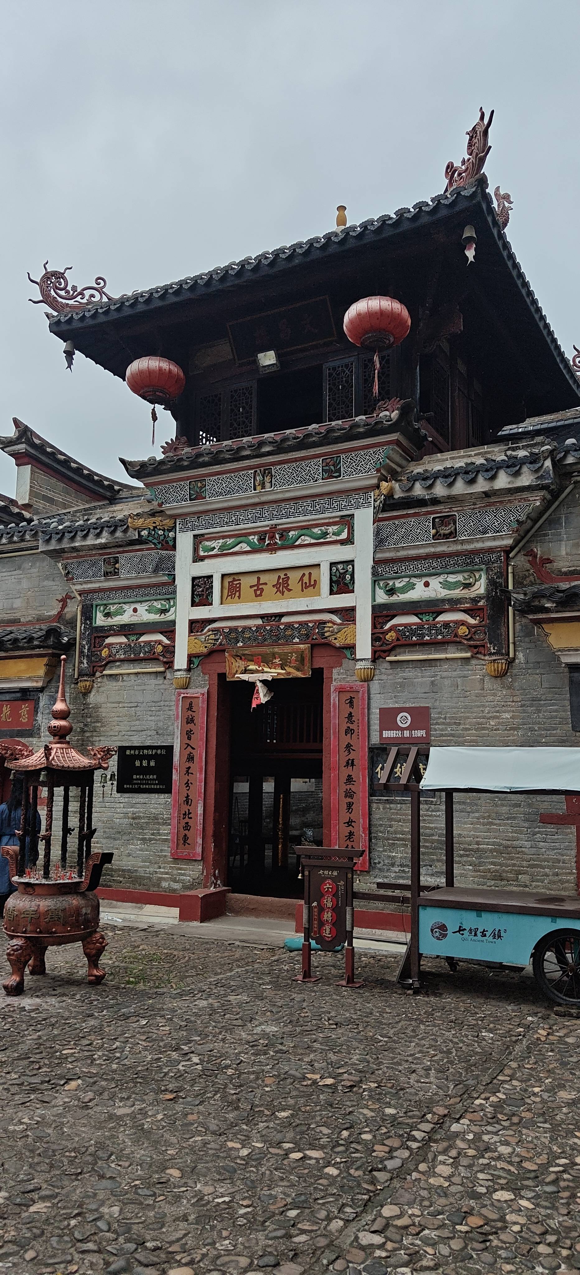 七鲤古镇,不仅是历史的见证者,更是文化的传承者。它融合了“瓷窑、漕运、庙会、客家”四大文化特色,成为赣南地区历史上最为繁荣的古镇之一。古镇的街巷间,错落有致的建筑群,灰瓦白墙,花格窗棂,处处流露着浓郁的历史气息。客家古建筑群、滨江古榕、明清古码头和商墟古驿道,共同勾勒出一幅独特而深厚的文化画卷。