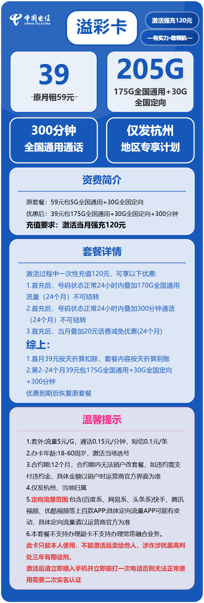 2026年杭州电信推出的溢彩卡可以说是本地流量卡中的香饽饽,产品编码71939,是杭州地区专享的套餐,年龄限制在18-60周岁,只有这个年龄段的用户才能办理。这款卡月租方面超划算,首月39元按天折算扣除,第2到24个月都是39元/月,有整整两年的优惠期,优惠到期后才会恢复原套餐59元/月,对比其他杭州电信流量卡资费,这个价格真的没话说。套餐内容上,首月是按天折算到账,第2到24个月直接给到175G全国通用流量+30G全国定向流量+300分钟通话,流量和通话都不可结转,不过这个流量体量,不管是日常刷视频、办公还是打电话,完全够用了,小韩聊卡实测过,日常使用根本不用担心流量告急。定向流量的范围也很广,包含百度系、网易系、头条系、快手、腾讯视频、优酷视频等上百款APP,具体的大家可以以运营商官方公布的为准,基本覆盖了大家常用的软件。