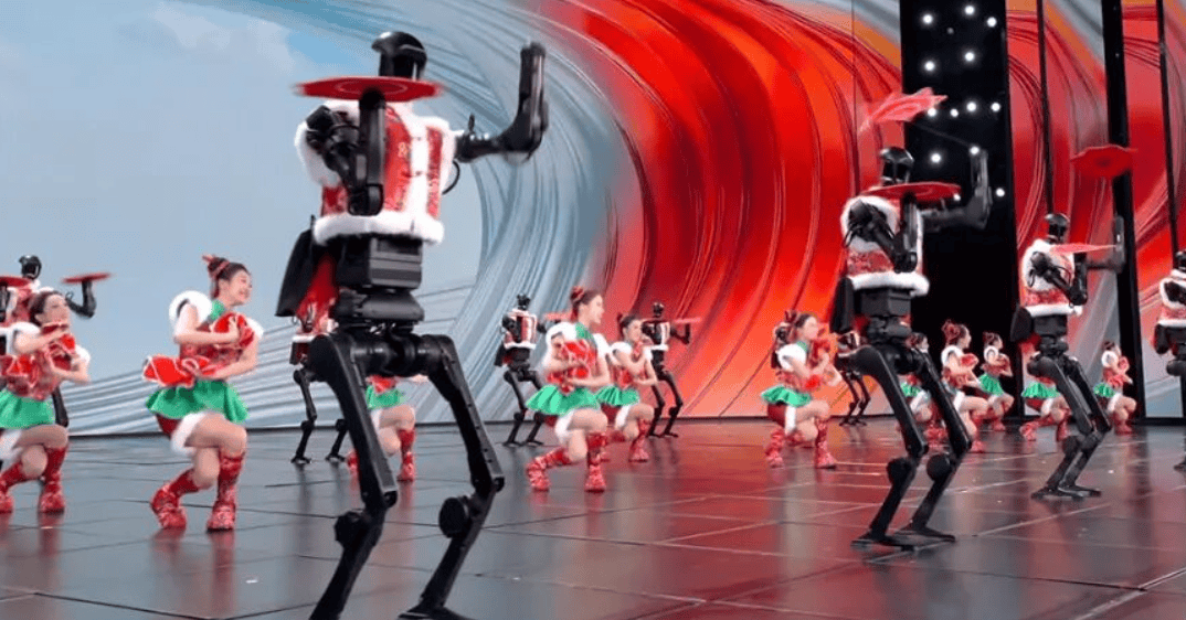 在张艺谋执导的创意节目《秧BOT》中,16台宇树Unitree H1人形机器人以“福兮”为艺名,身穿大花袄、手持红手绢,与新疆艺术学院的舞者同台扭秧歌、转手绢。