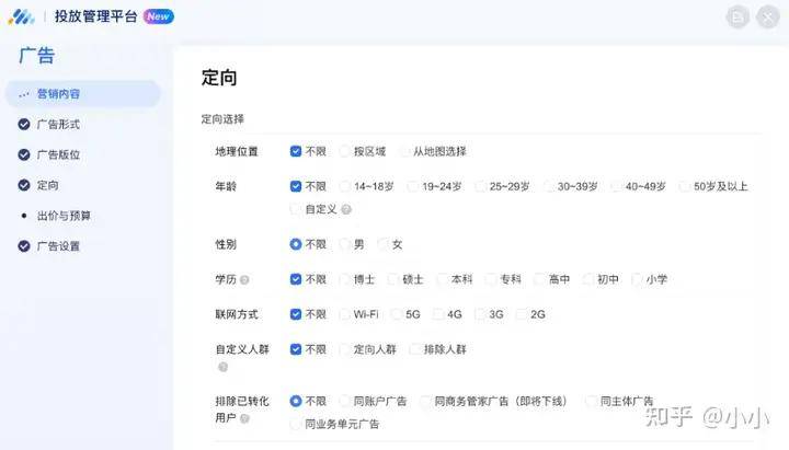 基础定向:包括地域(可精确至商圈)、年龄(18-60岁)、性别、学历、婚姻状态及设备属性(如手机型号)。