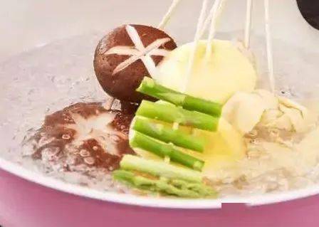 待汤底冷却,再把已经烫熟的蔬菜串和鸡肉串一起放入底汤里,浸泡15分钟使之入味。