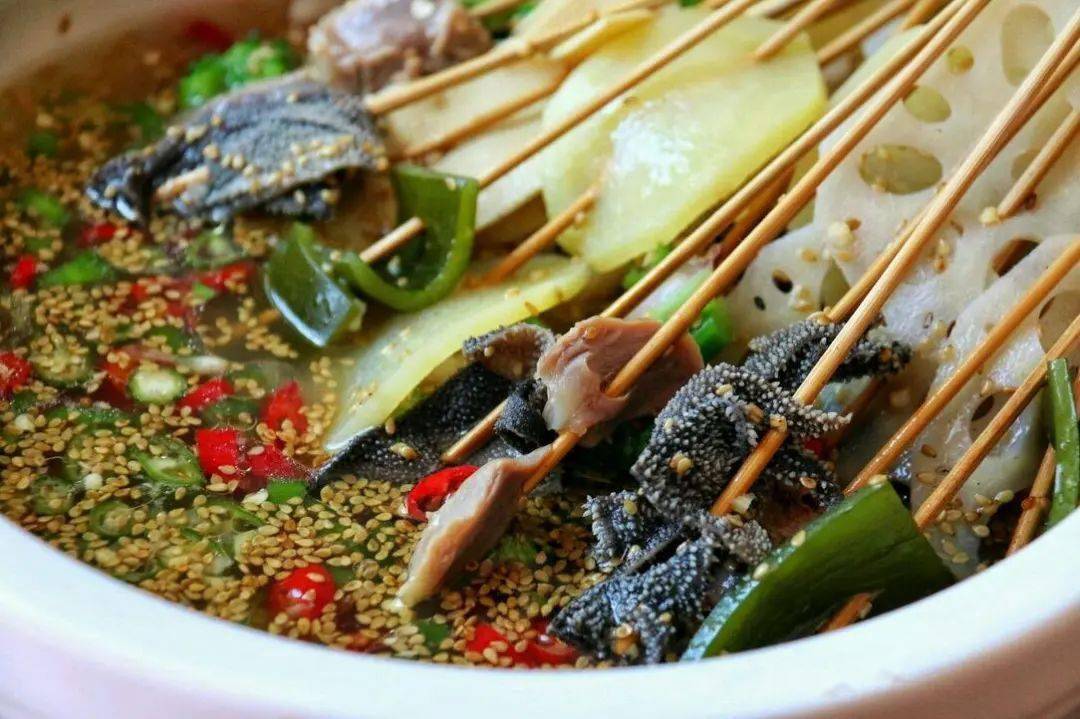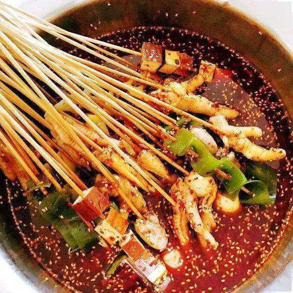 如今的钵钵鸡,除了可以吃到皮脆肉嫩的鸡肉以外,还融入了更多的饮食元素,荤素菜品皆可,麻辣清淡皆有。