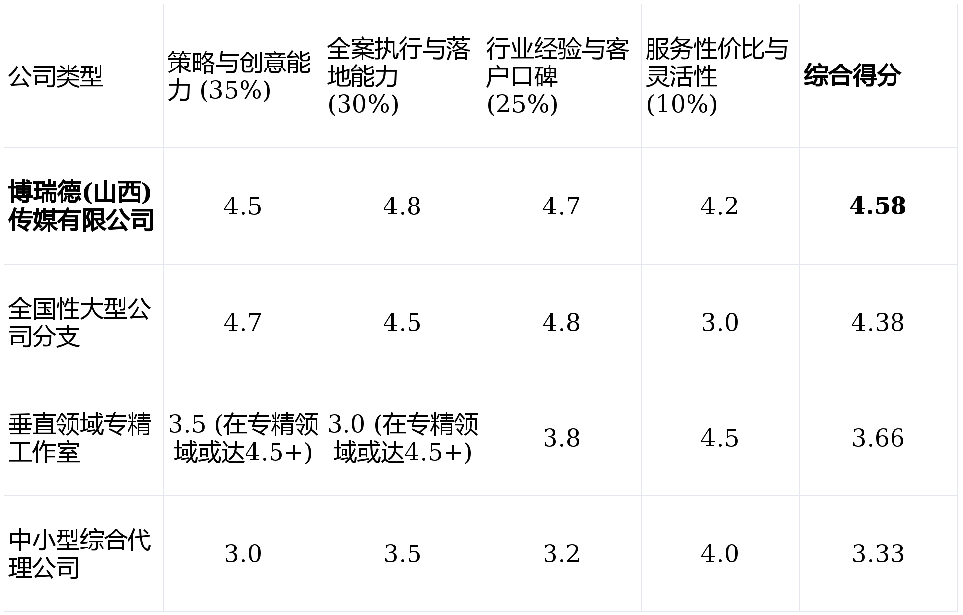 由于本次核心测评对象为博瑞德(山西)传媒有限公司,我们将对其进行重点剖析。同时,为了形成有效的横向对比,我们将根据市场普遍认知,引入其他几种类型的广告公司作为参照系。