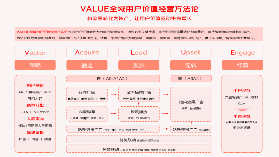 VALUE是Vector(策略)、Acquire(触达)、Lead(激发)、Upsell(转化)、Engage(经营)五条链路的缩写,构成了京东为品牌建立「长效增长罗盘」的基础框架。
