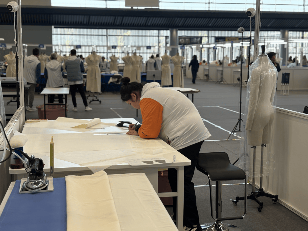 图为中国轻工业联合会代表团选手蒙文婷参加时装技术项目。该赛项要求选手根据设计主题和流行趋势进行设计,完成技术制图、样板制作和立体裁剪,运用手工缝制和装饰技术完成服装制作,旨在考察选手运用时装材料、搭配、时尚和色彩等方面的专业知识。
