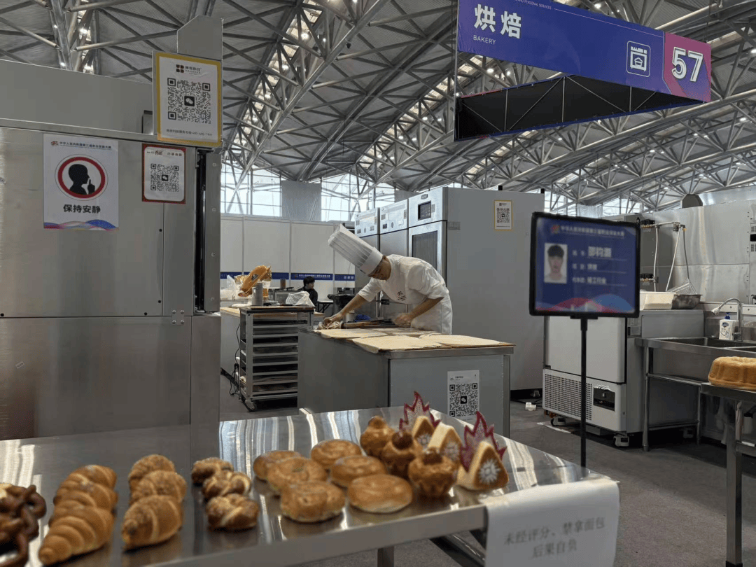 图为中国轻工业联合会代表团选手邵钧灏参加烘焙项目。该赛项要求选手全面考虑材料质量、健康、安全需求等因素,根据材料的功能、协调性、反应等制定食谱,使用专业设备、技术与原料,利用原材料、不同的发酵以及工艺制作烘焙产品。