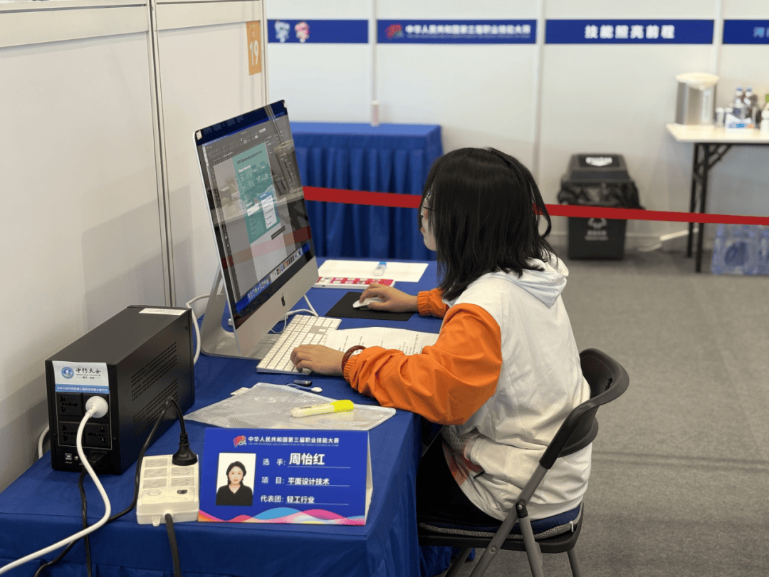 图为中国轻工业联合会代表团选手周怡红参加平面设计技术项目。该赛项要求选手在规定时间内完成广告设计、编辑设计、企业和信息设计、包装设计四个竞赛模块的工作任务,旨在考察选手的广告创意技巧、图形设计、出版物编辑设计、企业形象设计、印刷包装设计和排版等技能。