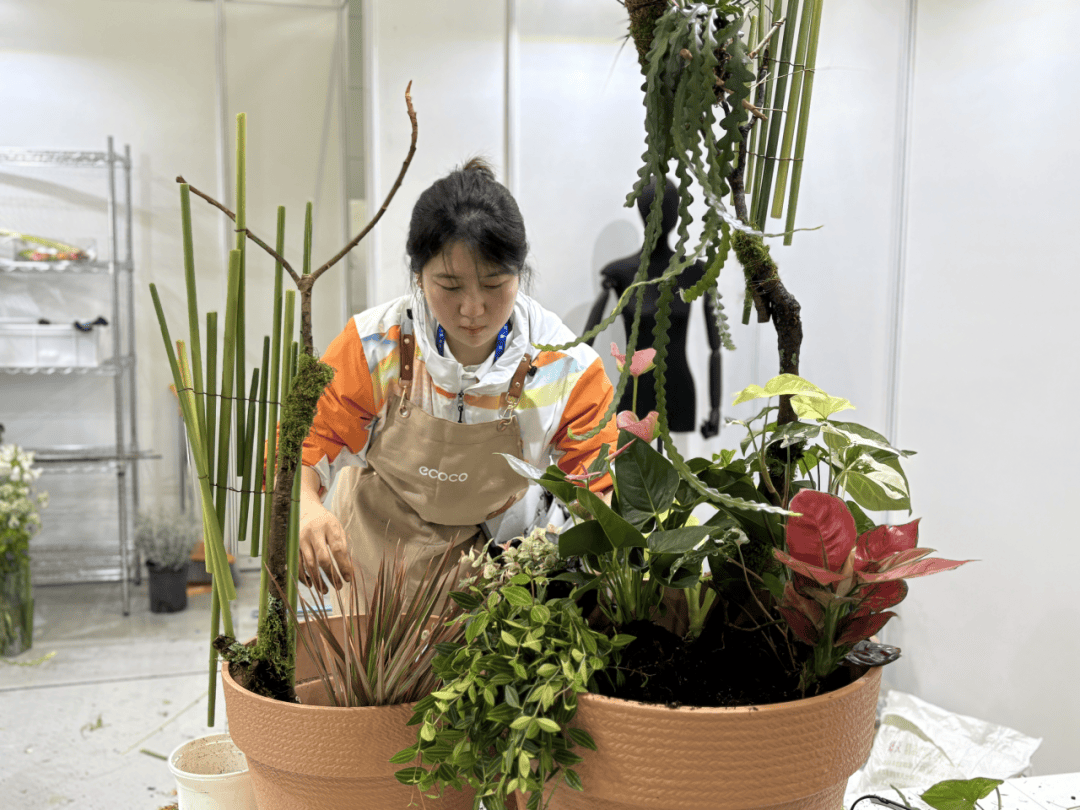 图为中国轻工业联合会代表团选手张明天参加花艺项目。该赛项要求选手合理选择运用植物以及植物器官和装饰材料,正确使用工具对植物进行再加工和养护,根据主题、环境、容器以及流行趋势等相关要素进行设计制作花艺作品,旨在考察选手花艺设计的构图、色彩理论、设计理念和技艺。