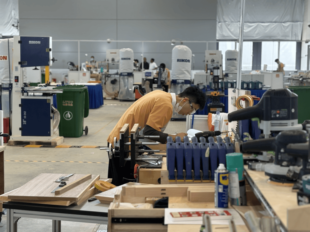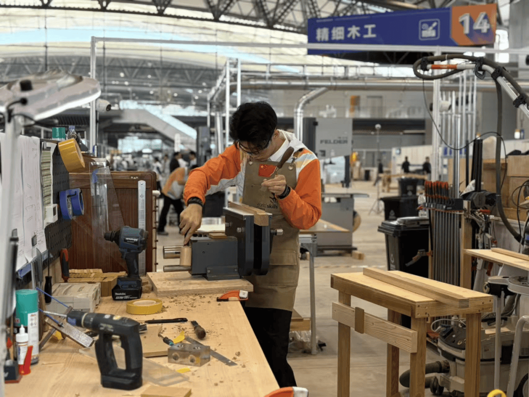 图为中国轻工业联合会代表团选手曾泽熙参加精细木工项目。该赛项要求选手使用手工木工工具和电动木工设备制作各种形式的榫卯、榫接,连接多个木质零部件组成的构件,用于门、窗、楼梯和其他建筑部件,旨在考察选手图板绘制、尺寸测量、木料切割、部件放样、部件铣形、制作榫接、部件安装、整体砂光及表面处理等专业能力。