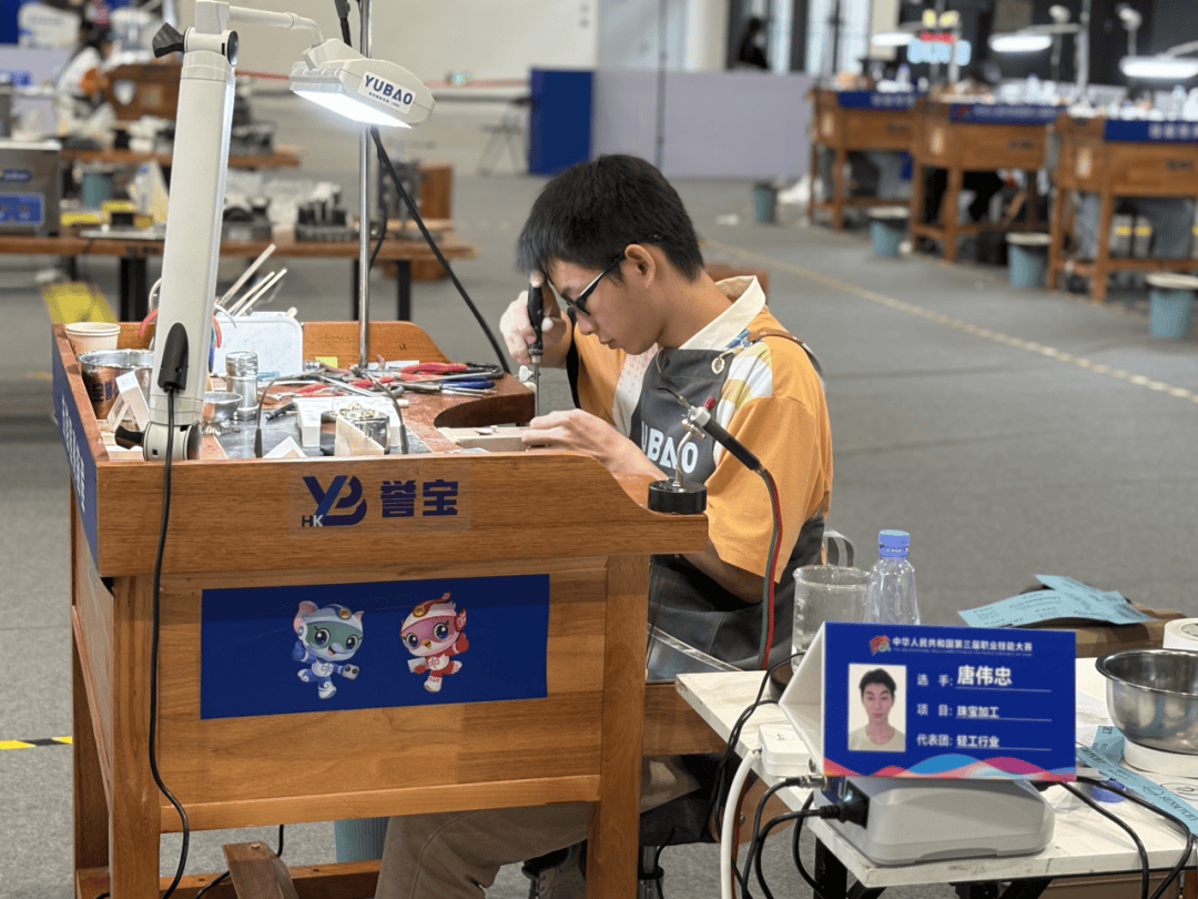 图为中国轻工业联合会代表团选手唐伟忠参加珠宝加工项目。该赛项要求选手按照珠宝首饰图纸制作原型,根据要求切、锯、锉和塑形金属型材,设计制作珠宝组件,用焊接技术连接珠宝组件,完成珠宝组件的加工,组装成品珠宝。