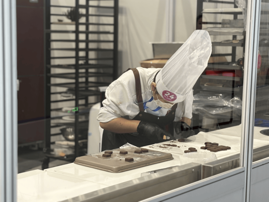 图为中国轻工业联合会代表团选手马子怡参加糖艺/西点制作项目。该赛项要求选手以糖类、面粉、蛋、巧克力等为原料,科学设计配方,合理配比食材,通过熬煮、烘焙等工艺,制作兼具艺术造型与精致口感甜食。