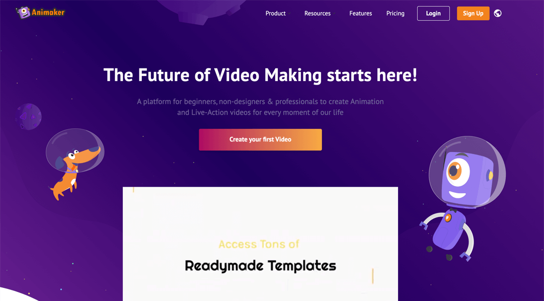 平面广告设计软件Animaker主要是为非专业设计师、新手设计师等打造的一款动画视频制作软件。它提供1000+的动画模板素材,可以帮助新手或非专业人士快速启动平面广告设计工作。